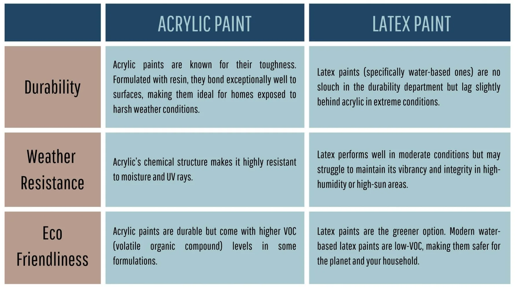 Acrylic’s chemical structure makes it highly resistant to moisture and UV rays. If you live in a region where summers are scorching or winters are wet, acrylic is the clear winner. This paint doesn’t just coat your house—it shields it.